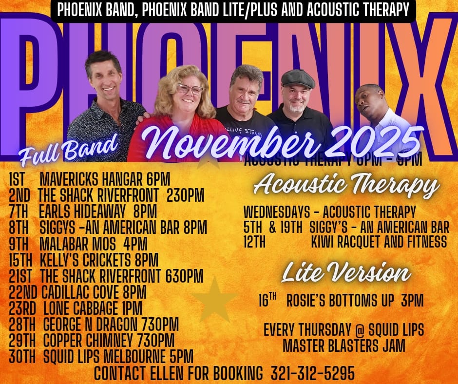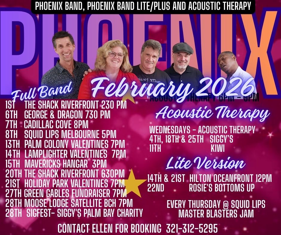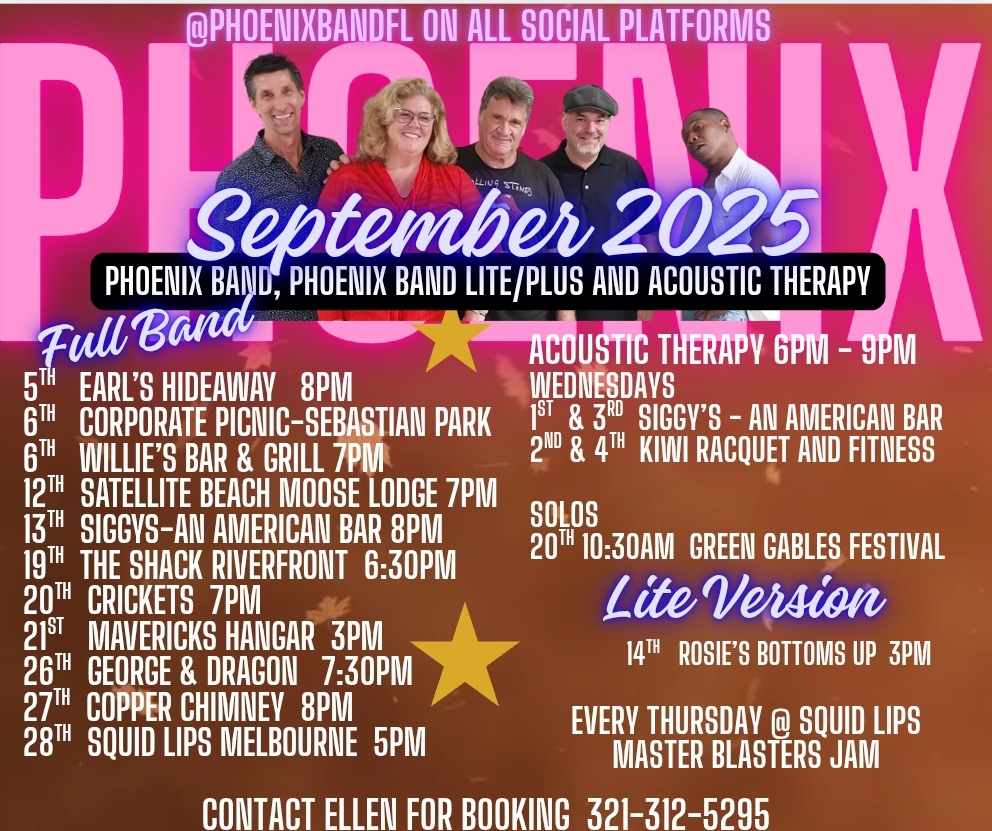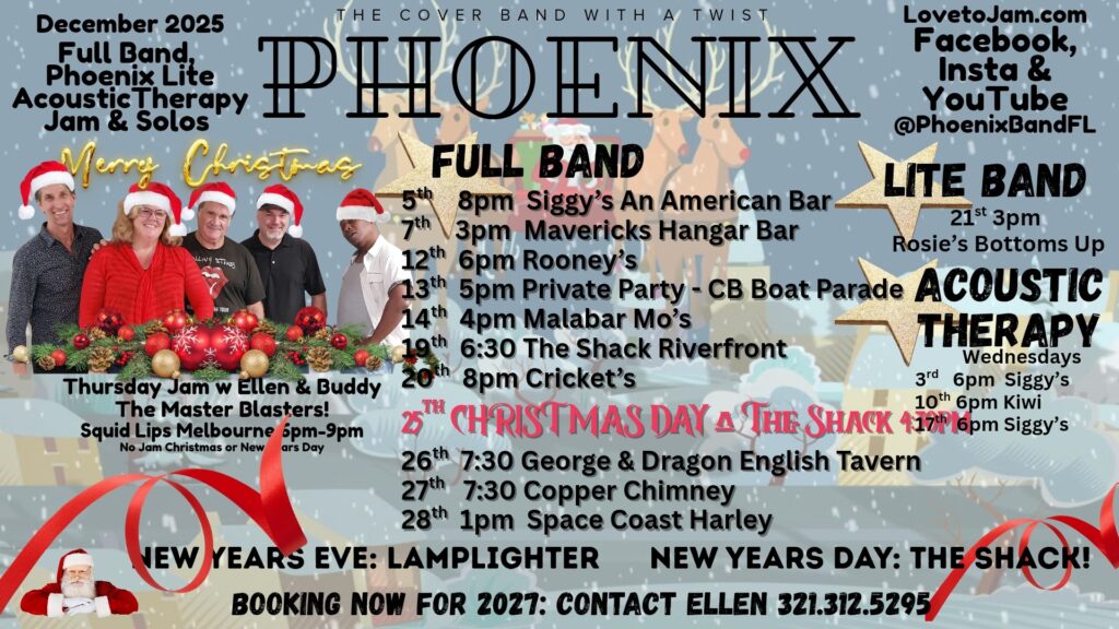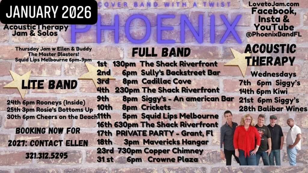 Brevard County’s Premier Party Band. We entertain you with the best Rock, Dance, Country, Motown, Jazz and More – selections from your favorite decades and styles of music. We put a Phoenix “twist” on everything, including all of your favorites. We cater to what our people want to hear, and what we love to play!